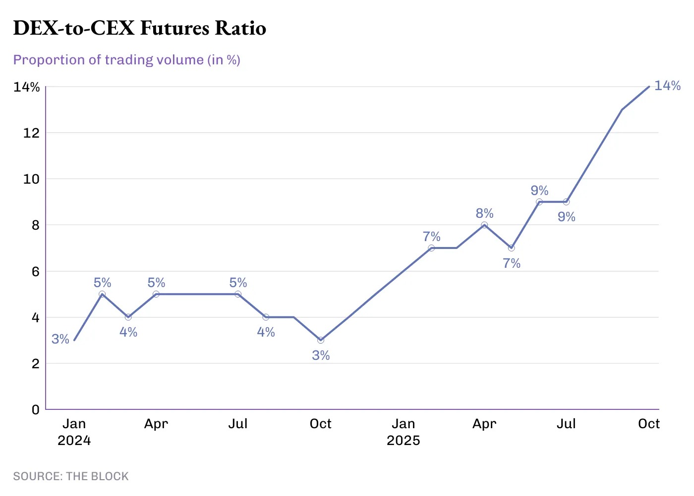 2024 年,去中心化交易所处理的全球期货交易量不到 5%。到 2025 年年中,这一数字翻了一番,达到 10%,到 10 月份,更是达到了 14.3%,创下了链上衍生品相对于中心化交易所的最高占比。