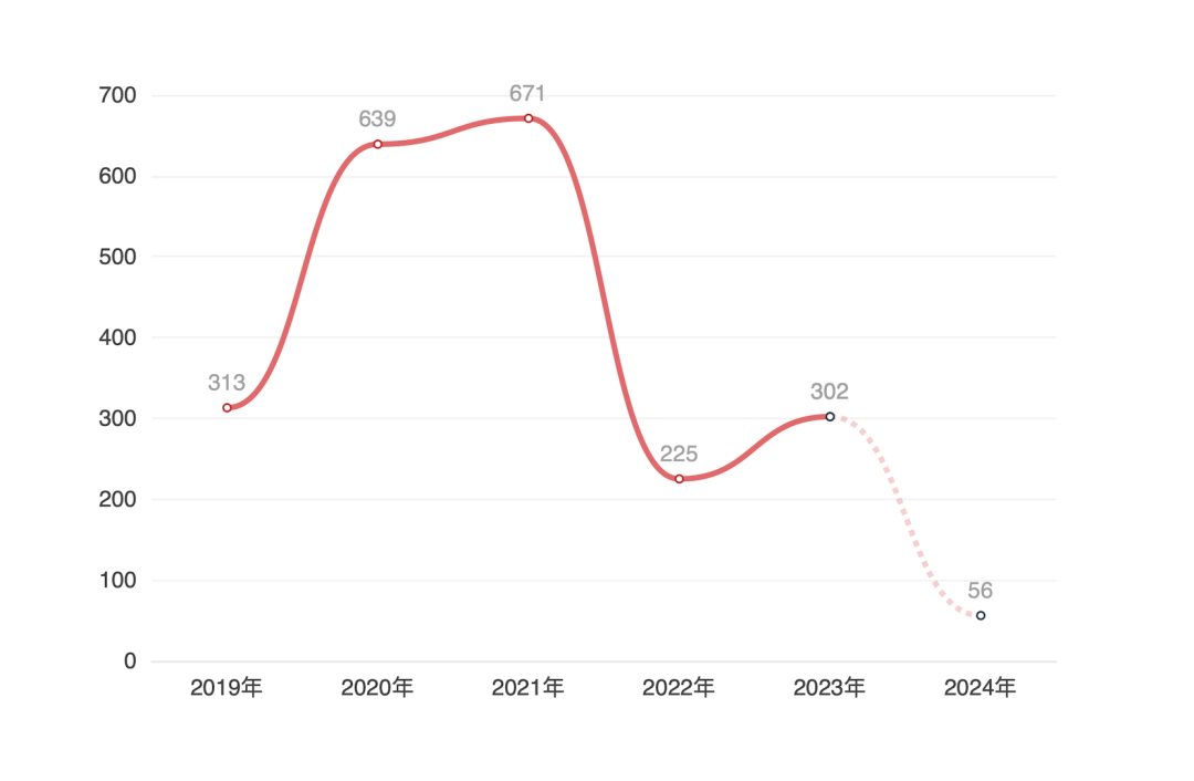 截止到2024年6月10日,威科先行数据库公开2019-2024年间涉虚拟货币刑事案件2206件。2019年至2021年三年间,涉虚拟货币刑事案件数量逐年增长,至2021年达到最高,2022年的案件数量相较于前一年明显减少,2023年呈现小幅度增长,但与2021年前公开的案件数量相比较,仍呈现下降趋势。可以推测,一方面是由于近年国内对于涉虚拟货币活动打击愈加严厉,在高压的监管背景下,公众对虚拟货币发行、交易过程中存在的违法犯罪风险认知程度也越来越高,同时相关发行、交易活动减少抑或以更为隐蔽的形式,如转向海外运营等方式进行,导致人员落地难度增加、案件调证难度增加、资金溯源追踪更难,由此导致犯罪数下降。另一方面,由于近期办理的涉虚拟货币刑事案件有一个诉讼过程,所以近两年的文书要在此后一年甚至更长的时间公布。