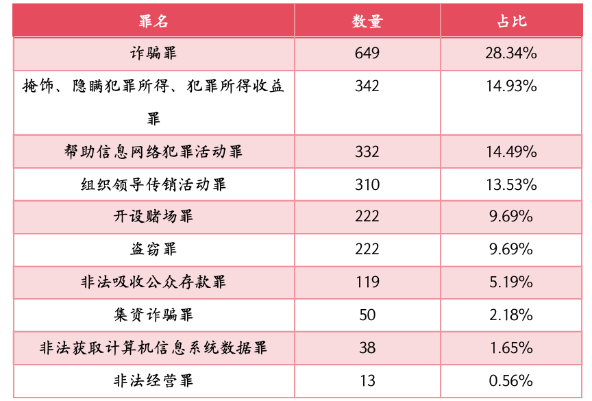 从涉虚拟货币刑事案件的案由来看,涉虚拟货币犯罪广泛分布于妨害社会管理秩序罪、侵犯财产罪和破坏社会主义市场经济秩序罪等领域,主要涉及诈骗罪、掩饰隐瞒犯罪所得、犯罪所得收益罪、组织领导传销活动罪、开设赌场罪、盗窃罪、非法吸收公众存款罪、集资诈骗罪、非法获取计算机信息系统数据罪、非法经营罪、洗钱罪等多个罪名。