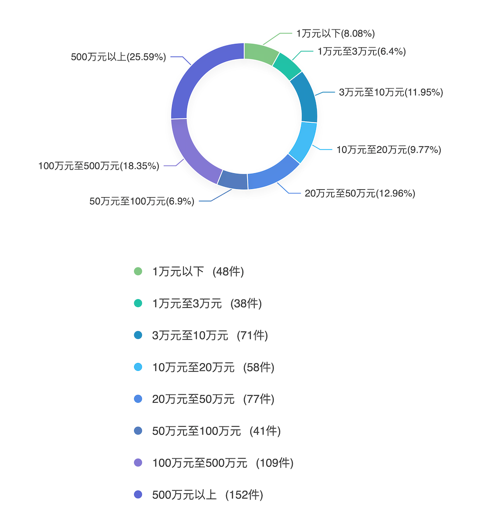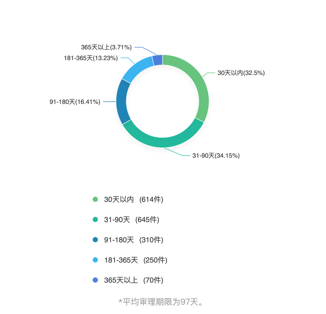 从审理期限来看,绝大多数案件审理期限在90天以内,极少数案件审理期限在365天以上,平均审理期限为97天。