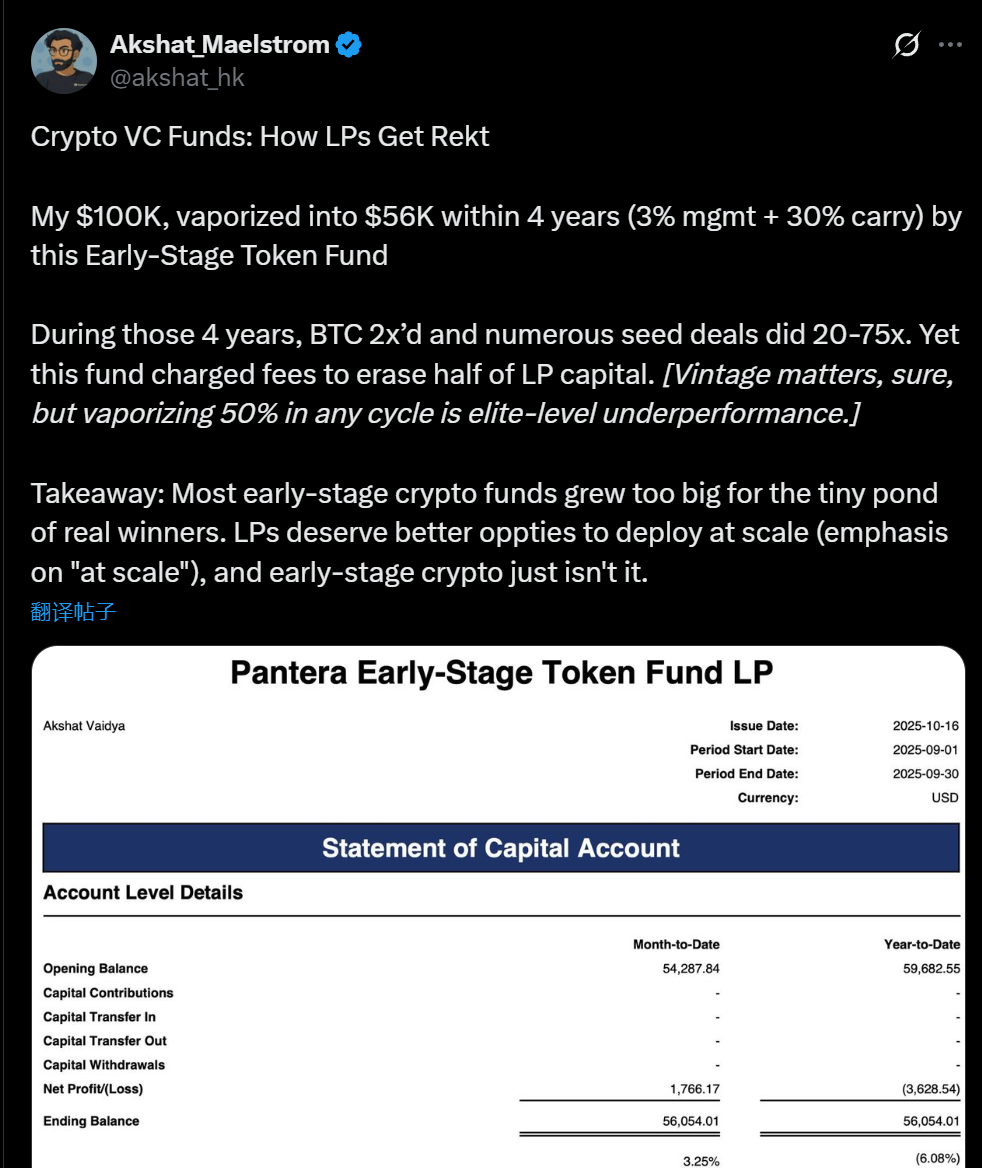 深潮 TechFlow 消息,11 月 3 日,Maelstrom Fund 投资主管 Akshat Vaidya 在社交媒体发文披露,其在某早期加密货币基金(截图显示是Pantera旗下基金)投资的10万美元,在4年后仅剩5.6万美元,亏损近50%。