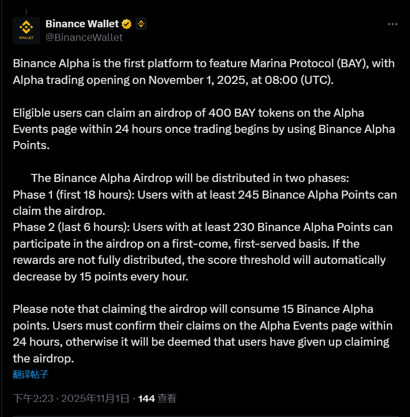 第一阶段(前 18 小时):拥有至少 245 个币安 Alpha 点的用户可以领取空投。