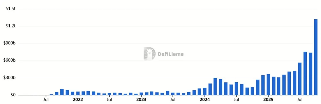 深潮 TechFlow 消息,11 月 1 日,据 Sentora 分析报告,DefiLlama 数据显示,去中心化加密货币永续合约月交易量首次突破 1 万亿美元大关,目前 30 天滚动交易量约为 1.3 万亿美元,未平仓合约约为 179 亿美元,标志着链上衍生品市场的结构性突破。