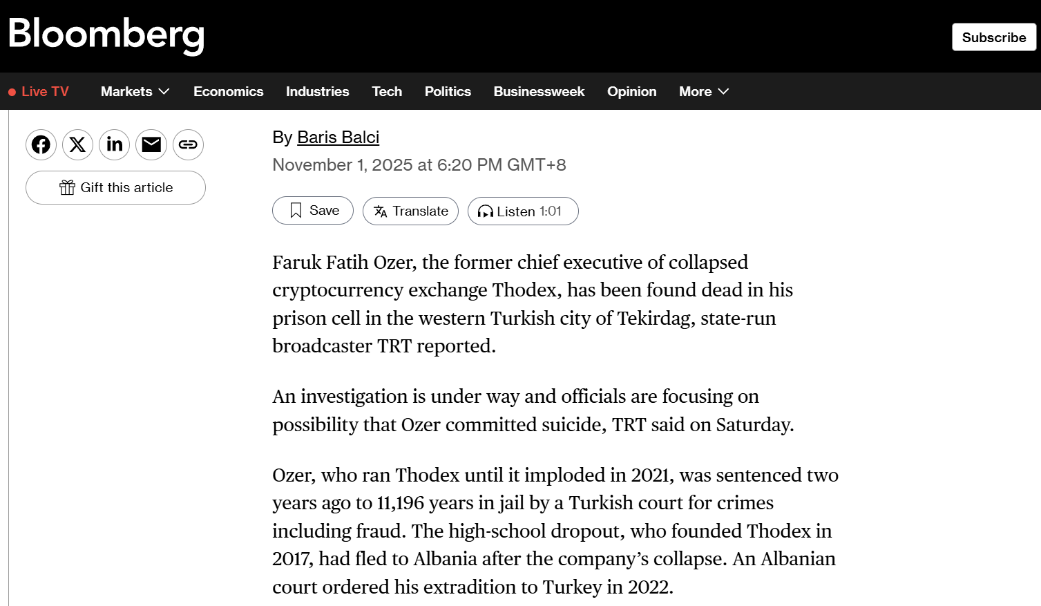 深潮 TechFlow 消息,11 月 1 日,据彭博社报道,已倒闭的加密货币交易所 Thodex 前首席执行官 Faruk Fatih Ozer 在土耳其西部城市泰基尔达的监狱牢房中死亡。