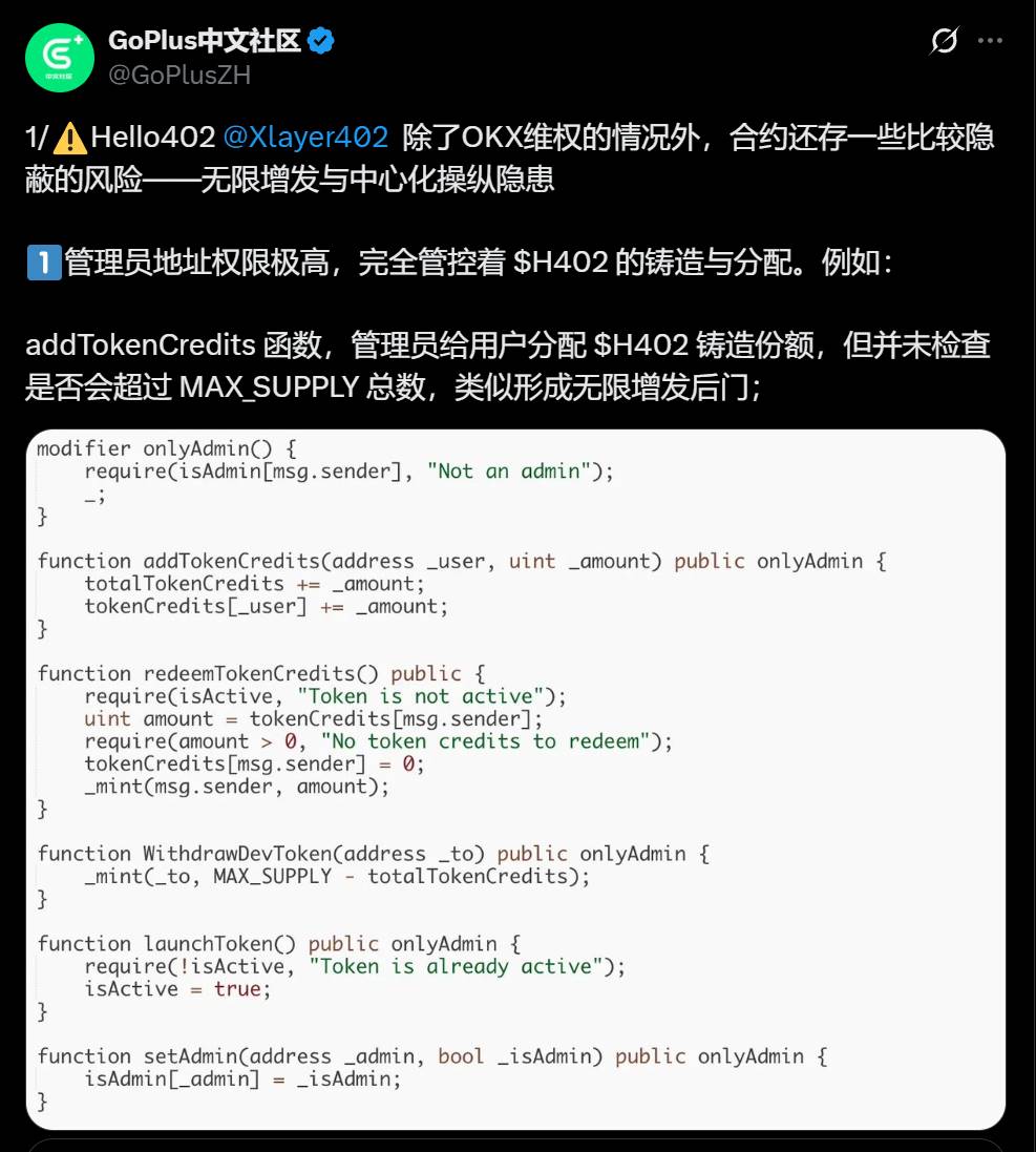 深潮 TechFlow 消息,11 月 12 日,GoPlus 在社交平台发文分析称,Hello 402合约存在一些比较隐蔽的风险——无限增发与中心化操纵隐患。
