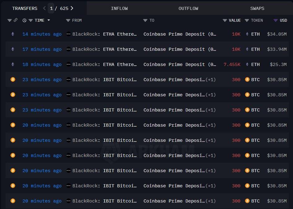 贝莱德再次向 Coinbase 存入 4652.87 枚 BTC 和 57455 枚 ETH