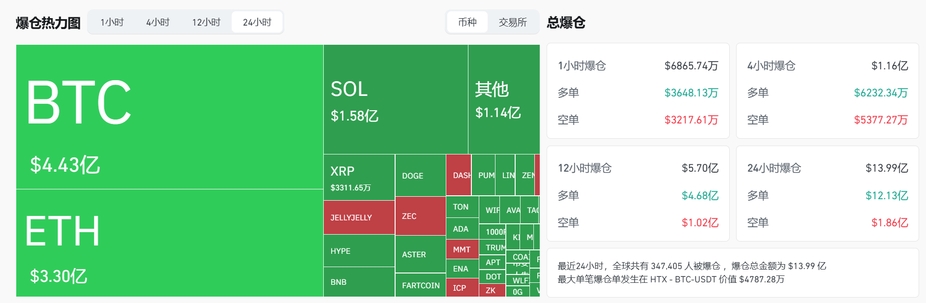 过去 24 小时全网爆仓 13.99 亿美元,主爆多单