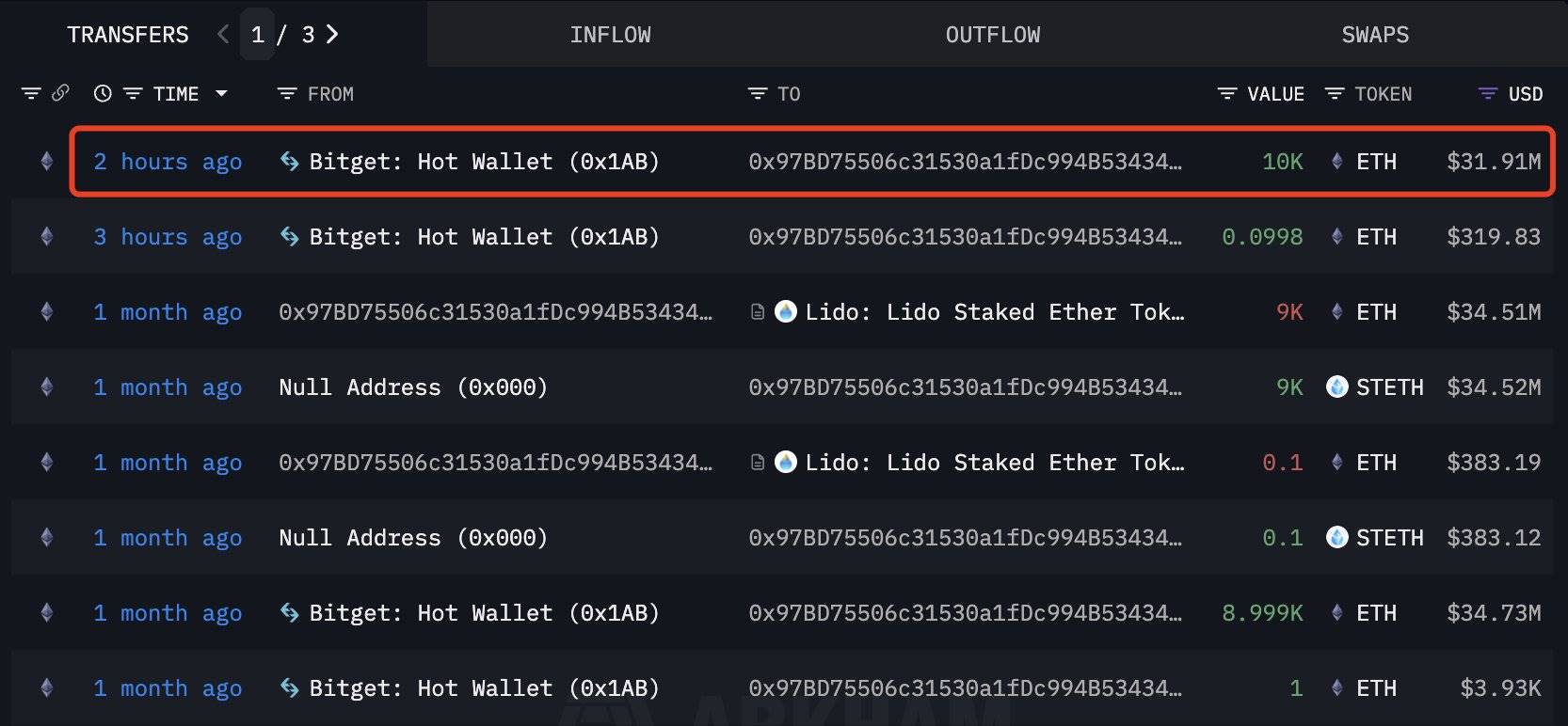 深潮 TechFlow 消息,12 月 4 日,据链上分析平台 Lookonchain 监测,鲸鱼地址 0x97BD 于 2 小时前再次从 Bitget 交易所提取 10,000 枚 ETH,价值约 3,191 万美元。