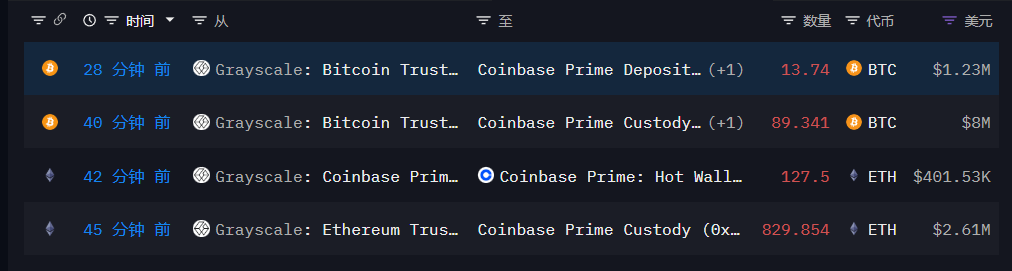 灰度向 Coinbase Prime 转入约 957 枚 ETH 和 103 枚 BTC,总价值超过 1200 万美元