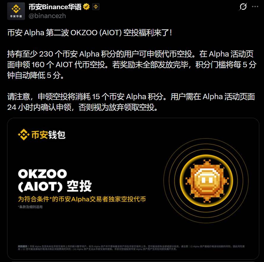 币安钱包:持有至少 230 个币安 Alpha 积分的用户可申领 160 个 AIOT 代币空投