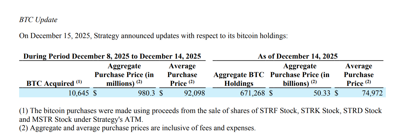 深潮 TechFlow 消息,12 月 15 日,据官方公告,Strategy 公司宣布已购入 10,645 枚比特币,耗资约 9.803 亿美元,均价约 92,098 美元。截至 2025 年 12 月 14 日,该公司共持有 671,268 枚比特币,总投资约 503.3 亿美元,均价约 74,972 美元。