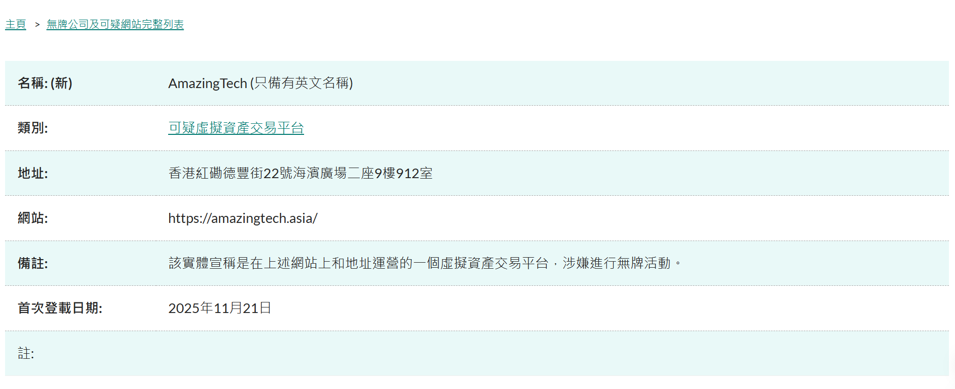 深潮 TechFlow 消息,11 月 22 日,香港证券及期货事务监察委员会发布公告,名为“AmazingTech”的虚拟资产交易平台已被列入“无牌公司及可疑网站名单”,定性为“可疑虚拟资产交易平台”。据悉,该实体声称在香港本地运营一个虚拟资产交易平台,涉嫌进行无牌活动。