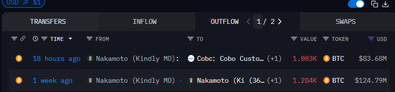 深潮TechFlow消息,11月22日,据分析师Emmett Gallic在X平台披露,Arkham监测数据显示比特币财库公司Nakamoto(原Kindly MD)已向Cobo转入1003枚BTC,作为其此前2.5亿美元可转换债券融资的抵押品,这也是该公司本周第二次追加BTC抵押,当时这笔交易发行价设定在比特币历史最高价12.4万美元,随着市场走低保证金承压明显,需密切关注过度杠杆化的风险。