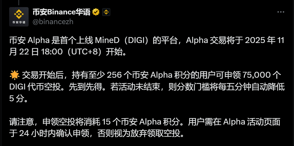 交易开始后,持有至少 256 个币安 Alpha 积分的用户可申领 75,000 个 DIGI 代币空投。先到先得。若活动未结束,则分数门槛将每五分钟自动降低 5 分。