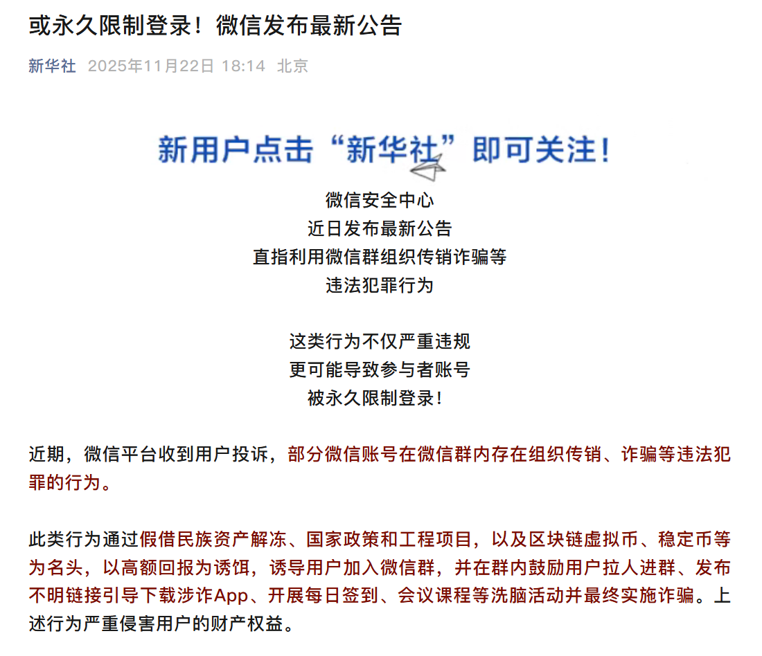 深潮 TechFlow 消息,11 月 22 日,新华社微信公众号转发此前微信安全中心公告发布安全提醒公告:“近期,微信平台收到用户投诉,部分微信账号在微信群内存在组织传销、诈骗等违法犯罪的行为。