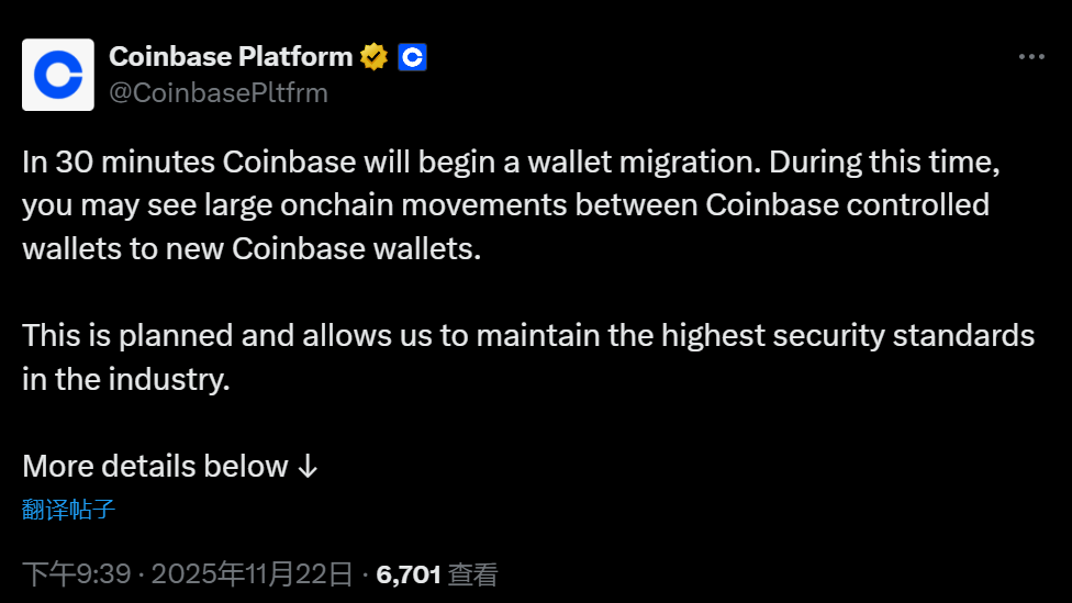 深潮 TechFlow 消息,11 月 22 日,Coinbase 官方在社交媒体发文表示,30 分钟后,Coinbase 将开始进行钱包迁移。在此期间,用户可能会看到 Coinbase 控制的钱包向新的 Coinbase 钱包之间发生大额链上转账。这属于计划内操作,旨在帮助 Coinbase 维持行业内最高级别的安全标准。