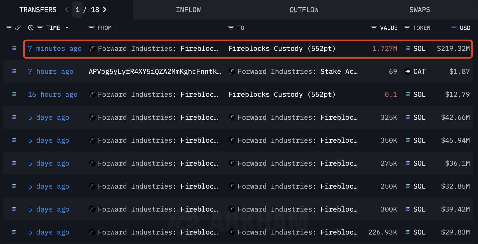 SOL 最大财库公司 Forward Industries 转出 172.7 万枚 SOL,约 2.1932 亿美元