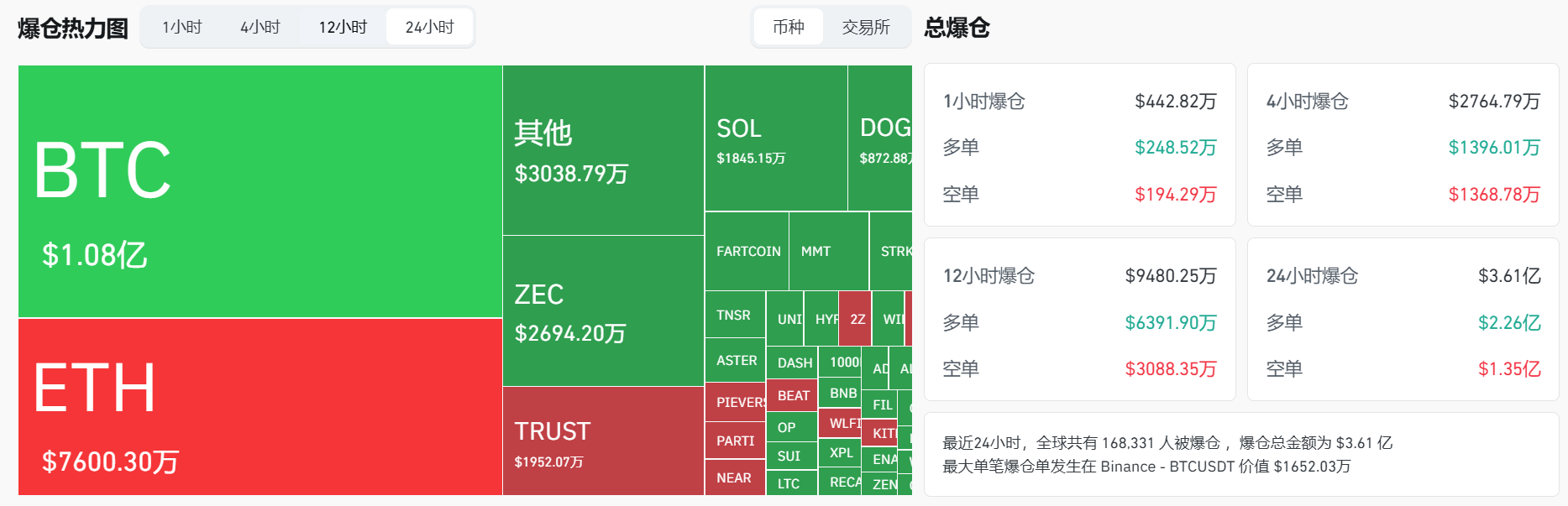 过去 24 小时全网爆仓 3.61 亿美元,主爆多单