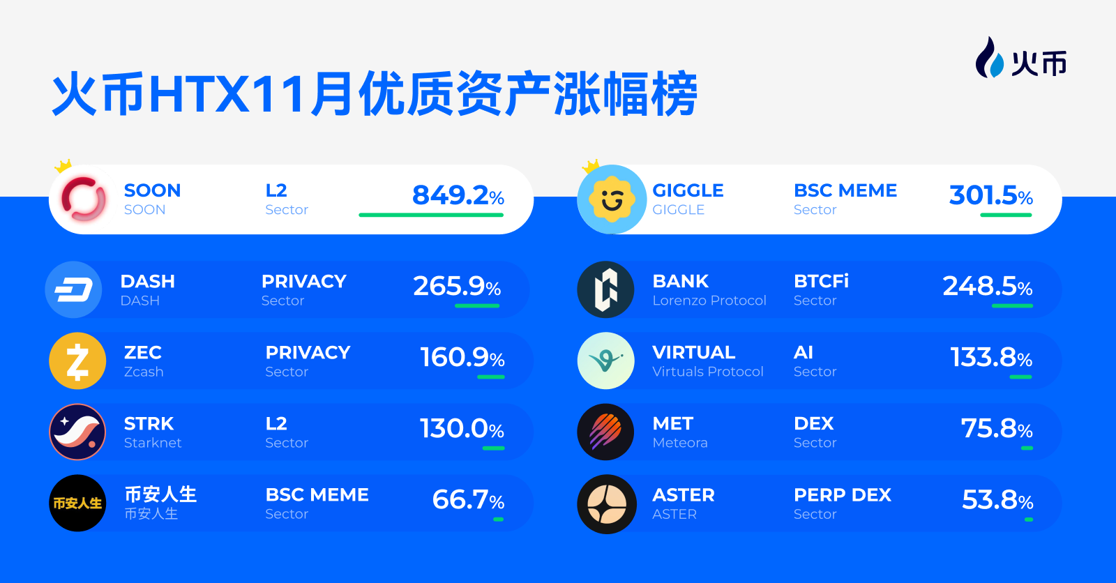 11月,加密市场在多重宏观与叙事催化下迎来结构性行情,从 BTCFi、AI、L2 到 DEX、MEME,各赛道项目轮动加速。得益于火币HTX 持续强化的“严选上新、快速响应”机制,多项优质资产在上线后取得亮眼表现。