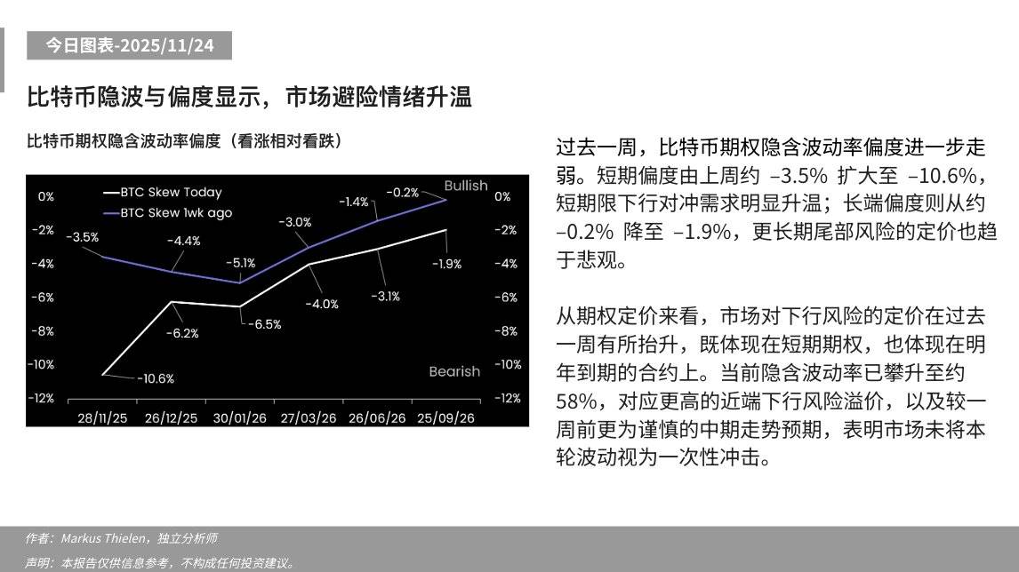 深潮 TechFlow 消息,11 月 24 日,Matrixport 发布今日图表称,“过去一周,比特币期权隐含波动率偏度进一步走弱。短期偏度由上周约-3.5% 扩大至 -10.6%,短期限下行对冲需求明显升温;长端偏度则从约-0.2% 降至-1.9%,更长期尾部风险的定价也趋于悲观。