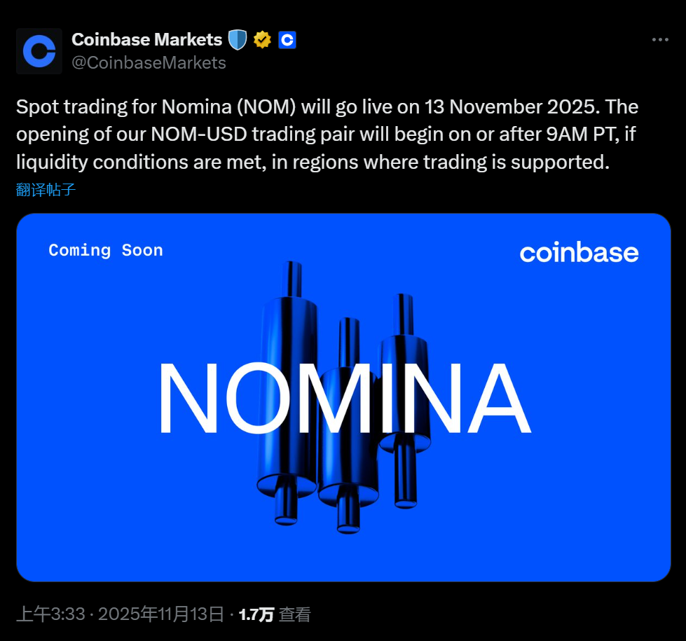 深潮 TechFlow 消息,11 月 13 日,据官方公告,Coinbase 今日凌晨宣布将于 2025 年 11 月 13 日上线 Nomina(NOM)现货交易,NOM/USD 交易对将在当日太平洋时间上午 9 点或之后在满足流动性条件的前提下开放,Nomina 是一个面向永续期货 DEX 的统一交易平台。