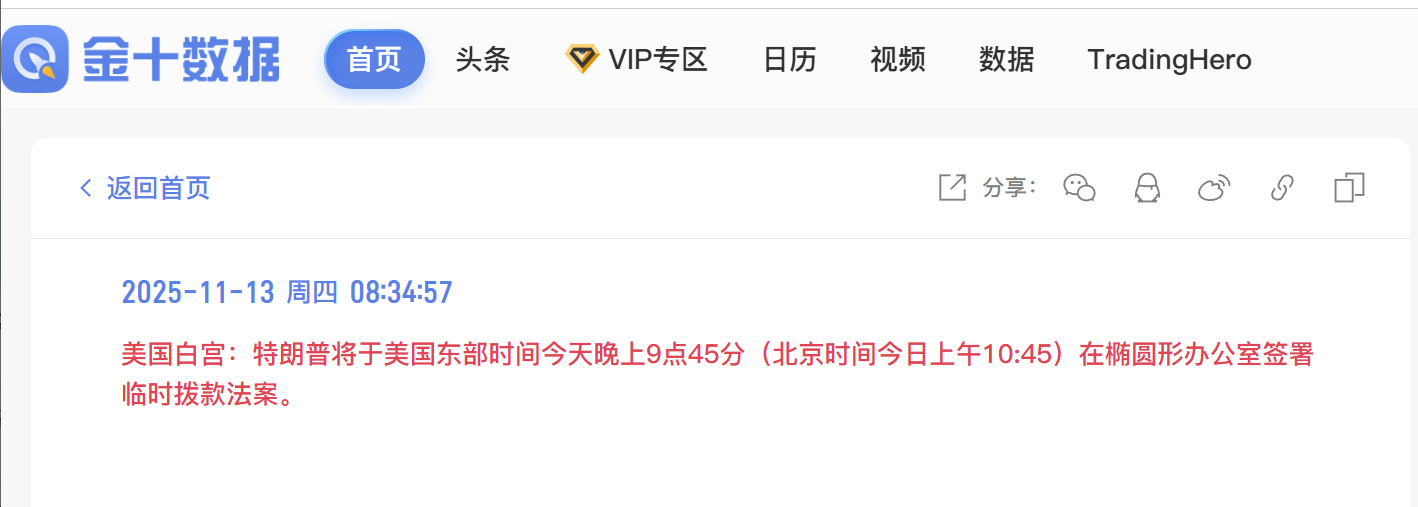 据金十数据报道,美国国会众议院已扫除关键程序性障碍,为已在参议院通过的拨款法案进行全院投票铺平道路,以结束政府停摆。在政府停摆进入第43天之际,众议院议员们于周三以213票赞成、209票反对的结果推动该法案进入下一阶段。拨款法案现将进行一小时的辩论,随后进行最终投票表决。白宫稍早前表示,特朗普希望今晚(北京时间周四上午)签署结束政府停摆的法案。