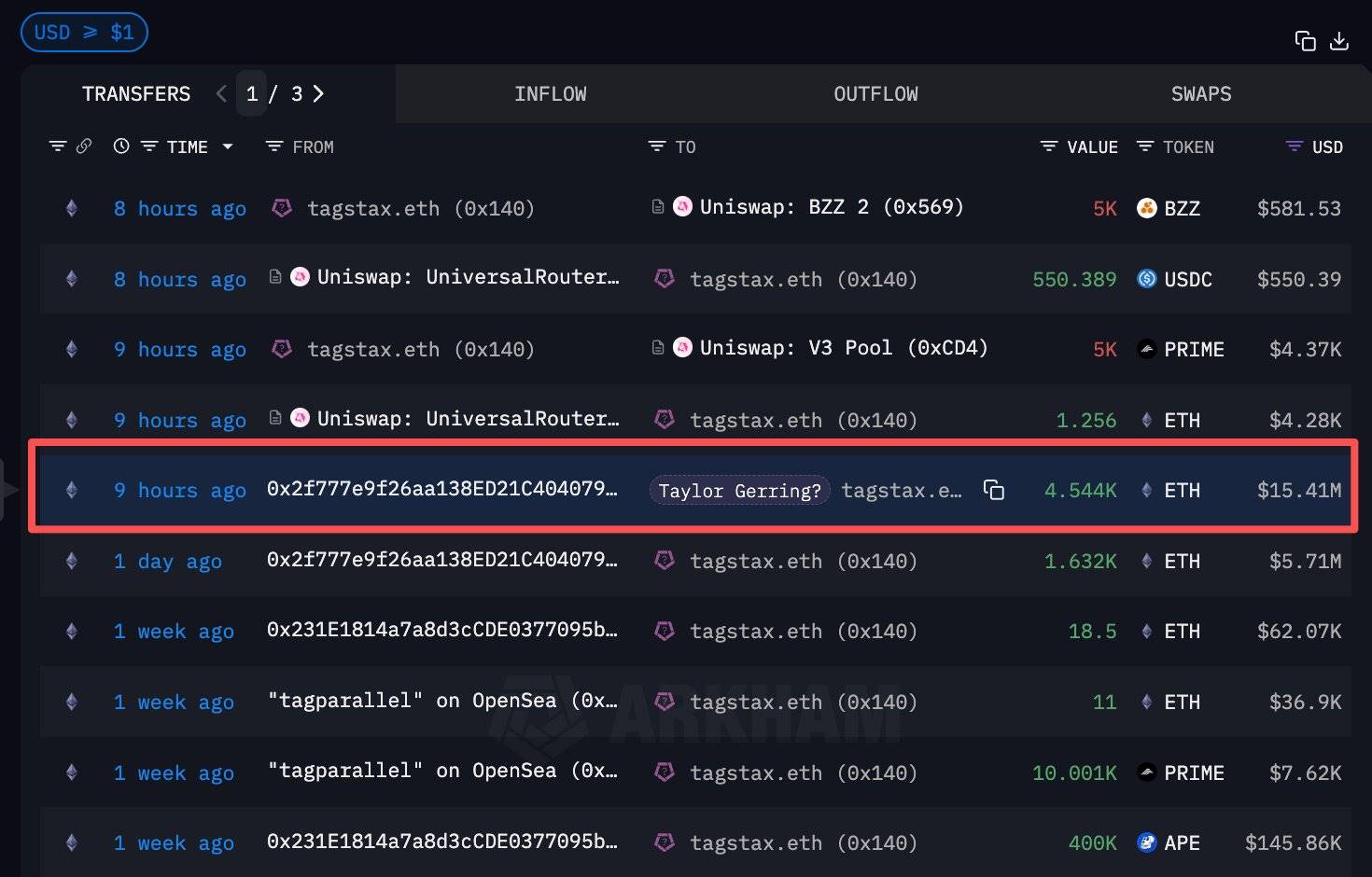 深潮 TechFlow 消息,11 月 13 日,据链上分析师 Ai 姨(@ai_9684xtpa)监测,以太坊联合创始人 Taylor Gerring 关联地址 tagstax.eth 在 9 小时前收到 4544 ETH,价值 1541 万美元,目前暂未转移或卖出。