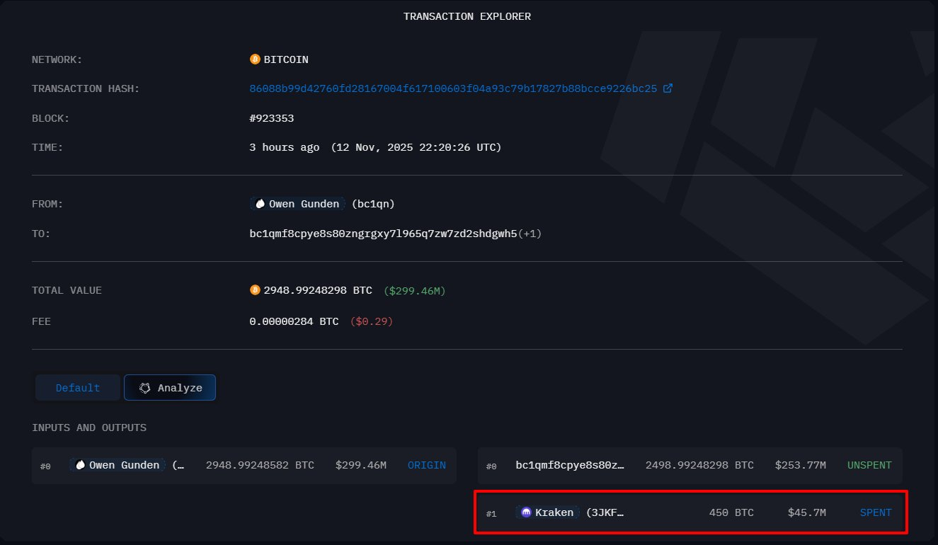 深潮 TechFlow 消息,11 月 13 日,据 Onchain Lens 监测,Owen Gunden 已向 Kraken 交易所存入 450 枚 BTC,价值约 4570 万美元。目前 Owen Gunden 仍持有 4900 枚 BTC,价值约 5 亿美元。