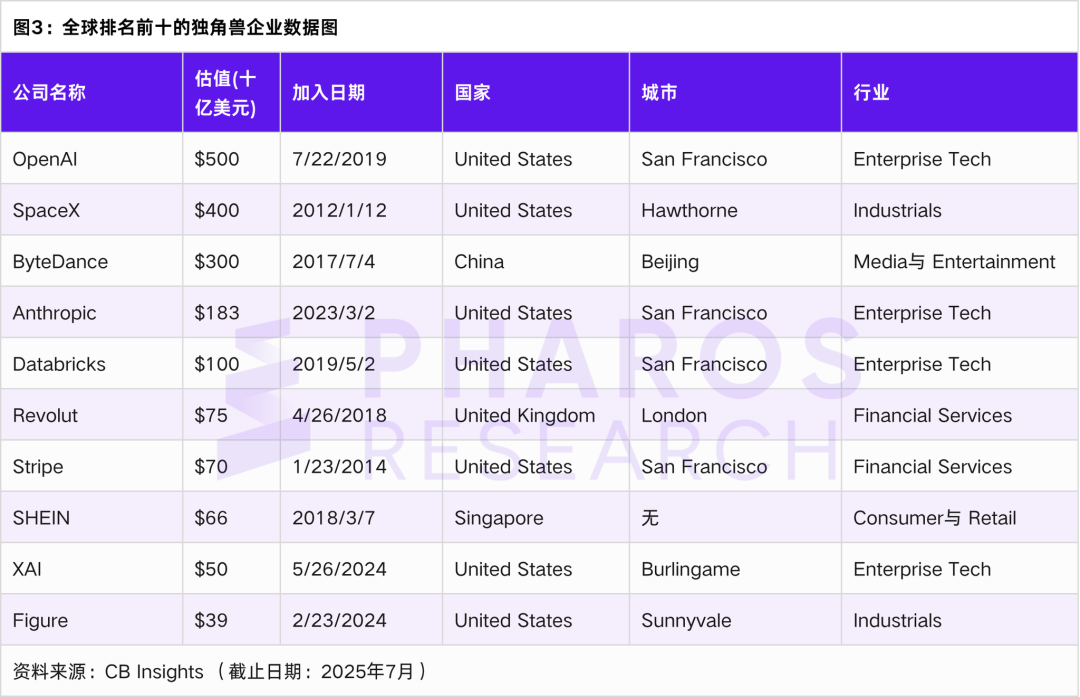 图 1 即列示了 CB Insights 统计的全球估值排名前十的独角兽,其中 OpenAI(估值超 5000 亿美元)、SpaceX(估值 4000 亿美元)与字节跳动(估值 3000 亿美元)高居榜首。