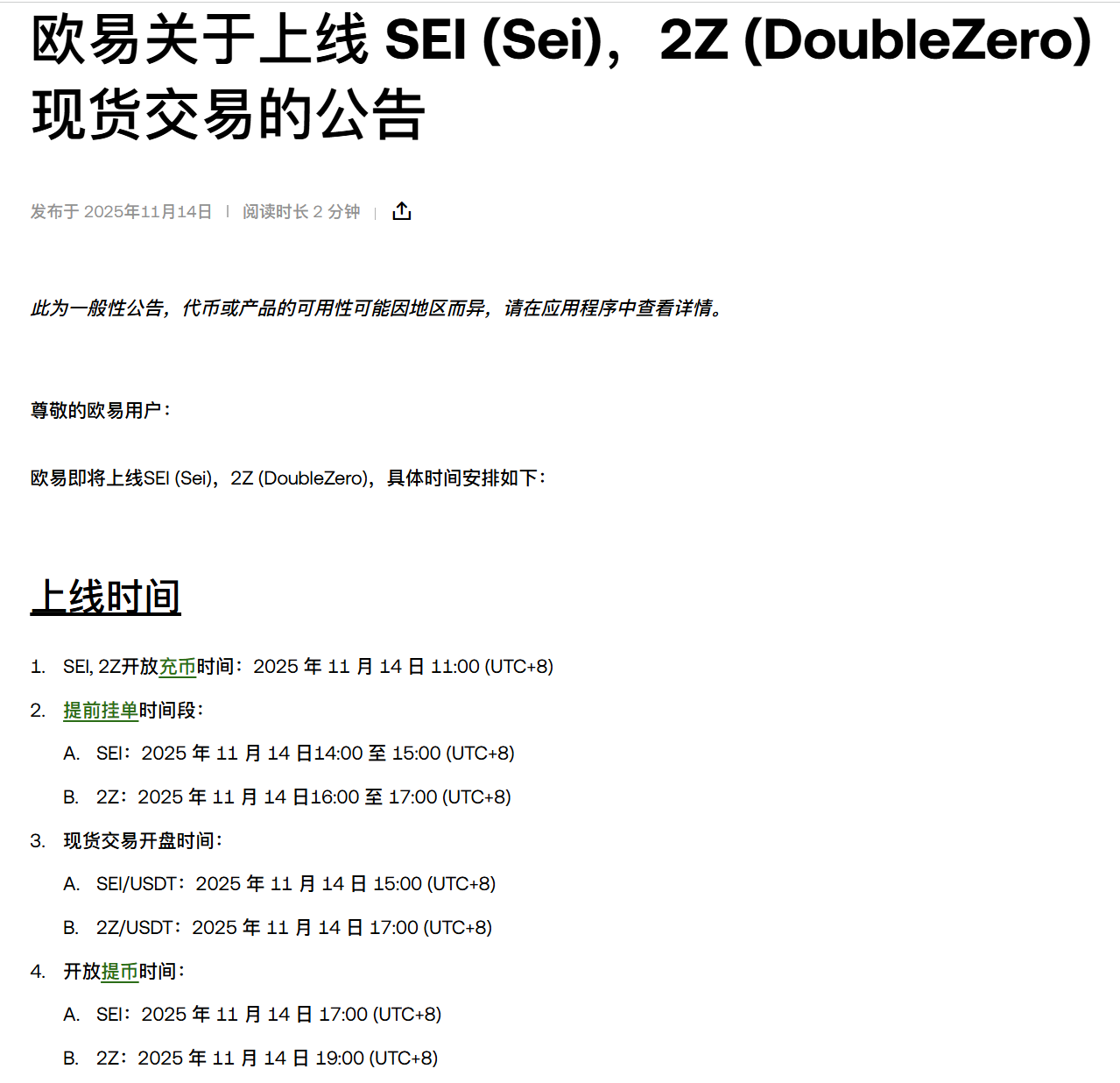 OKX 将上线 SEI (Sei),2Z (DoubleZero)现货交易