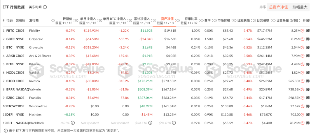 截至 11 月 13 日,据 SoSoValue 数据,比特币现货 ETF 总净流出 6.13 亿美元。昨日单日净流出最多的比特币现货 ETF 为富达(Fidelity) ETF FBTC,单日净流出为 1.199 亿美元,目前 FBTC 历史总净流入达 119.2 亿美元。