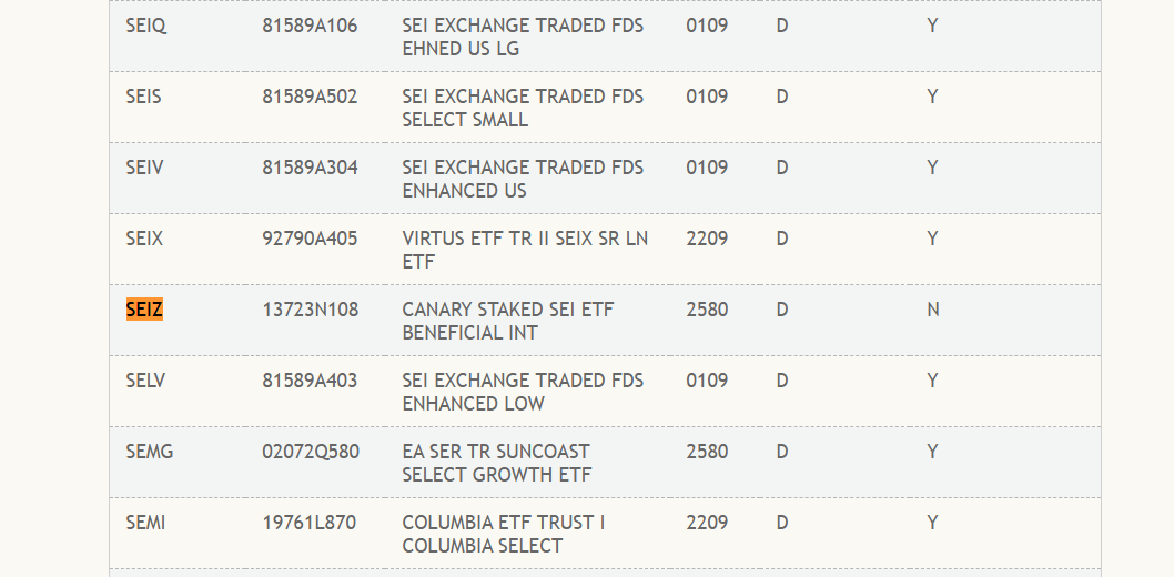 深潮 TechFlow 消息,11 月 14 日,据 DTCC 官网显示,DTCC(美国存托信托与清算公司)列出 Canary 质押 SEI ETF,交易代码为 SEIZ。