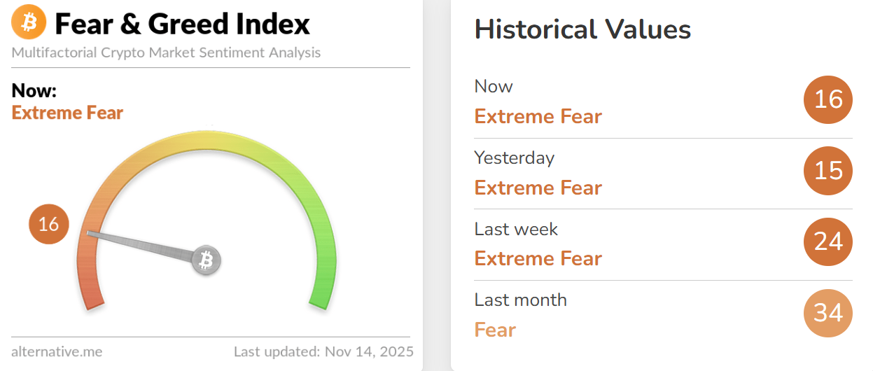 深潮 TechFlow 消息,11 月 14 日,据 Alternative.me 数据,今日加密货币恐慌与贪婪指数升至 16(昨日该指数为 15),表明市场仍处于「极度恐慌状态」。