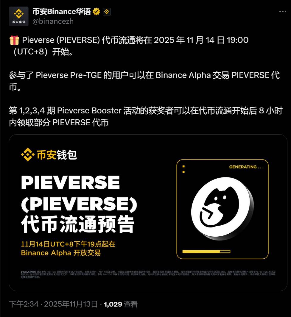 深潮 TechFlow 消息,11 月 13 日,据币安官方公告,Pieverse (PIEVERSE) 代币流通将在 2025 年 11 月 14 日 19:00(UTC+8)开始。