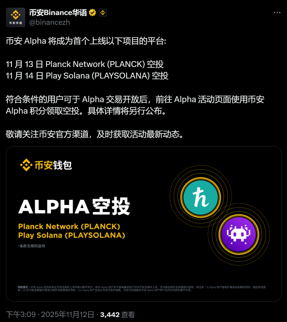 币安是首个公告开放Planck (PLANCK) 合约交易以及在币安Alpha展示 PLANCK 代币的平台。 作为上线福利,所有符合资格的币安用户将获得币安独家代币空投。符合资格的用户需要于2025年11月13日20:00(东八区时间)至2025年11月14日20:00(东八区时间)期间,使用币安Alpha积分通过币安Alpha活动页面领取空投。用户可以通过币安App的搜索功能访问币安Alpha活动页面,点击此处查看更多关于如何使用币安Alpha积分领取Alpha空投信息。