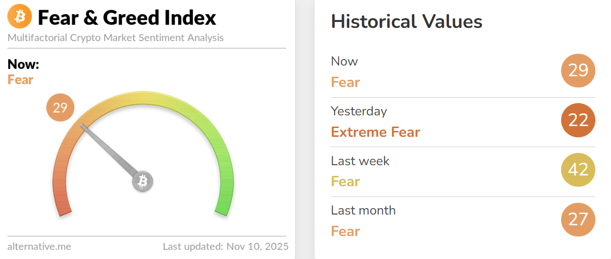 深潮 TechFlow 消息,11 月 10 日,据 Alternative.me 数据,今日加密货币恐慌与贪婪指数升至 29(昨日该指数为 22),表明市场由「极度恐慌状态」转为「恐慌状态」。