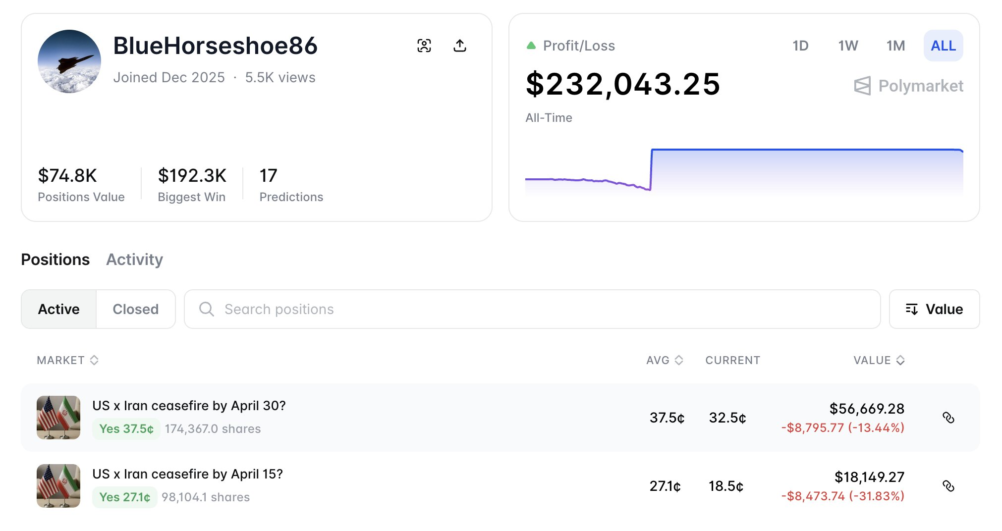 深潮 TechFlow 消息,3 月 19 日,据链上分析平台 Lookonchain(@lookonchain)监测,链上交易员 BlueHorseshoe86 在预测市场累计投入约 9.2 万美元,押注美国与伊朗将于 4 月 15 日或 4 月 30 日前达成停火协议。该交易员此前曾押注”马杜罗下台”,获利约 26 万美元。